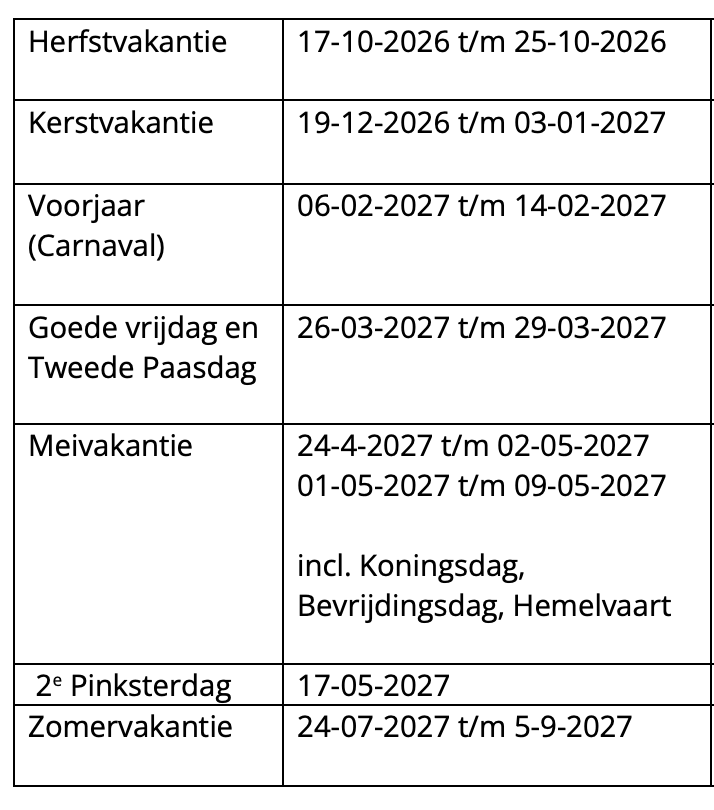 Daarmee wordt in de planning van het vakantierooster rekening gehouden. Jaarlijks wordt dit vakantierooster met de MR (instemmingsrecht) besproken en vastgesteld.